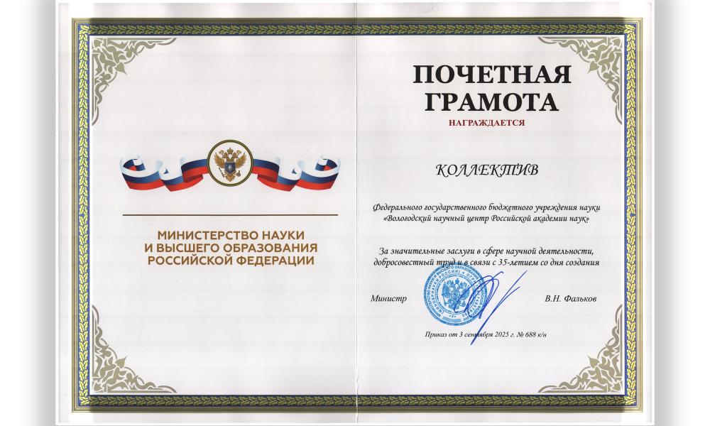 В связи с 35-летием со дня основания коллектив ВолНЦ РАН награжден Почетной грамотой Министерства науки и высшего образования Российской Федерации за значительные заслуги в сфере научной деятельности.