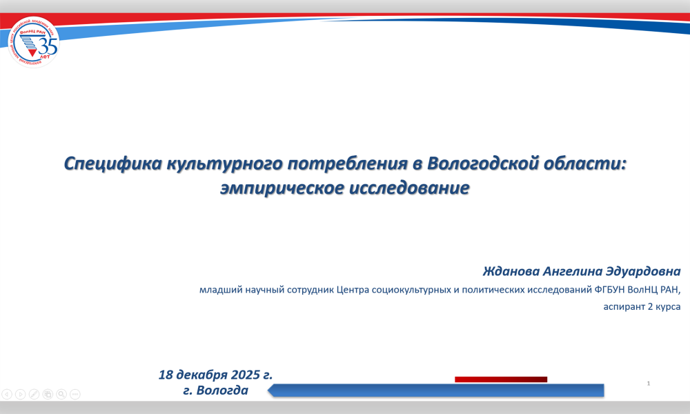 18 декабря 2025 года младший научный сотрудник Центра социокультурных и политических исследований ВолНЦ РАН Ангелина Эдуардовна Жданова представила доклад на тему «Специфика культурного потребления в Вологодской области: эмпирическое исследование» на заседании постоянно действующего научного семинара-дискуссии «Социальная экономика» в рамках научной школы ВолНЦ РАН «Проблемы социально-демографического развития территорий» (руководитель – д.э.н., доцент А.А. Шабунова). Результаты исследования культурно-досуговых предпочтений населения Вологодской области с учетом территориальной специфики получены в рамках выполнения Государственного задания № FMGZ-2025-0015 «Социокультурное развитие и социодинамика общественно-государственных отношений в российских регионах».