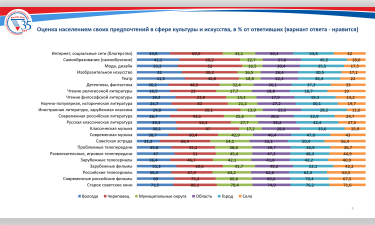 В рамках работы выявлено, что доминирующими формами досуга в Вологодской области являются неформальное общение («встречи с друзьями») и пассивный отдых. Важны при этом территориальные различия: для жителей крупных городов (г. Вологда, г. Череповец) более характерны активные и социальные формы досуга, тогда как в сельской местности преобладают пассивные практики и ведение домашнего хозяйства. Наибольшей популярностью у населения пользуется кинематограф, при этом положительно оцениваются как советские, так и современные российские фильмы и сериалы. Цифровизация трансформирует культурное потребление, однако интернет в основном используется для коммуникации и получения новостей, а не для потребления «высоких» культурных продуктов. Исследование показало, что значительная часть респондентов отмечает сокращение числа «культурных людей» в своем окружении. Следует отметить, что в массовом сознании «культурный человек» ассоциируется с воспитанностью, вежливостью, образованностью и эрудированностью. Результаты подчеркивают необходимость учета региональной специфики при разработке культурной политики.
