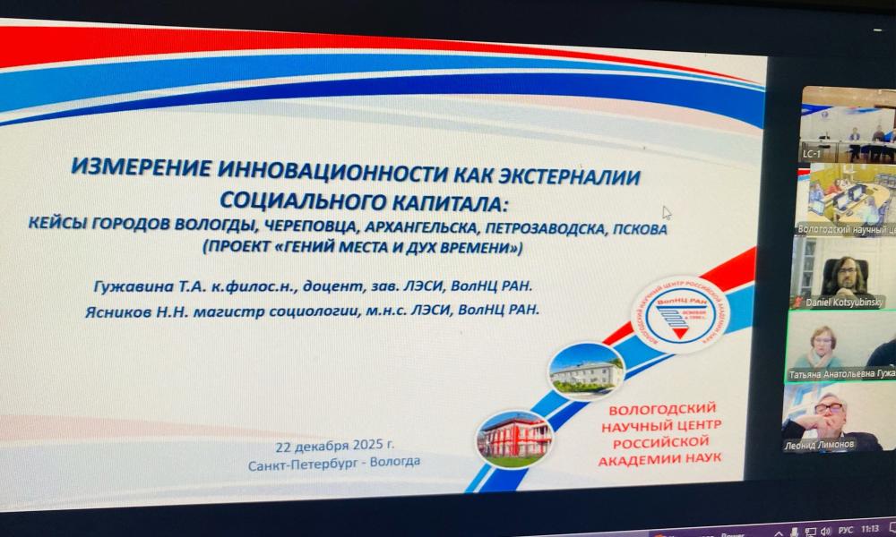 22 декабря 2025 года состоялся научный семинар по проекту «Гений места – дух времени», организованный МЦСЭИ «Леонтьевский центр» (г. Санкт-Петербург) совместно с Вологодским научным центром РАН.