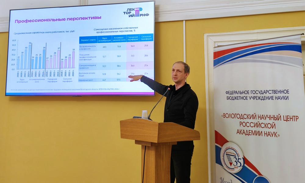 Руководитель гранта РНФ № 24-78-10168 «Формирование экосистем устойчивого развития локальных территорий как ответ на глобальные и региональные вызовы современности» в.н.с. к.э.н. А.В. Попов выступил с докладом «Периферия для людей или люди для периферии: возможна ли жизнь за пределами крупных городов?», который был посвящен проблемам диспропорций пространственного развития и будущему локальных территорий, находящихся вдали от центров концентрации ресурсов. Результаты исследования продемонстрировали, как экономические, социальные, демографические и инфраструктурные ограничения влияют на качество жизни и формируют устойчивые миграционные потоки в сторону крупных городов. Ключевым элементом доклада стало описание экосистемного подхода, предполагающего рассмотрение локальных территорий как сложных систем взаимодействия государства, бизнеса, учреждений социальной сферы, НКО. В этом контексте было предложено направление по модернизации государственной службы занятости – переход от традиционной к более гибкой модели, учитывающей социальные потребности человека и его семьи. Формирование такой экосистемы содействия занятости, по мнению ученого, способно повысить устойчивость периферийных территорий.
