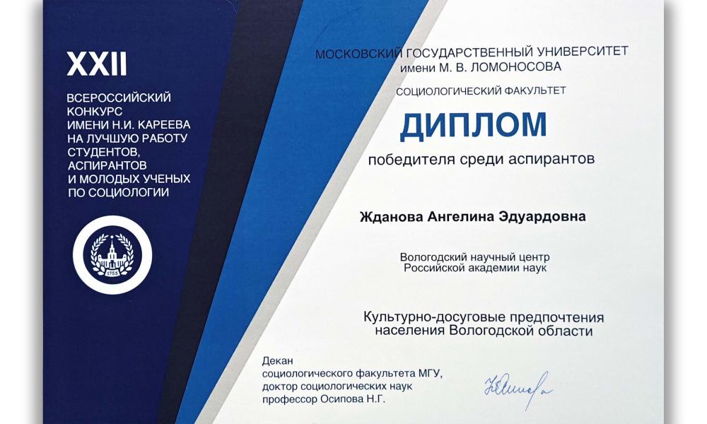 М.н.с. Центра социокультурных и политических исследований ВолНЦ РАН А.Э. Жданова стала победителем среди аспирантов в XXII Всероссийском конкурсе имени Н.И. Кареева на лучшую работу по социологии, представив свое исследование «Культурно-досуговые предпочтения населения Вологодской области».
