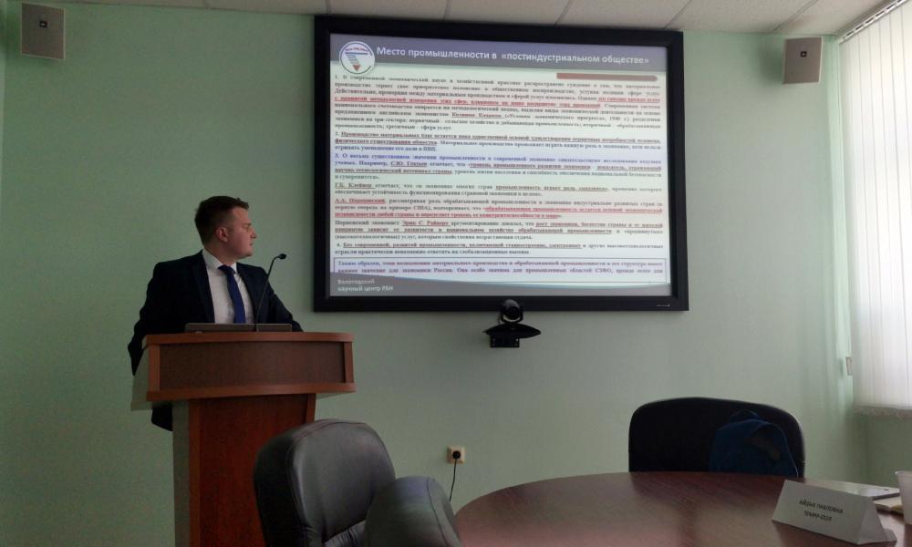 - старший научный сотрудник к.э.н. Владимир Сергеевич Усков («Формирование промышленной политики РФ в условиях научно-технических изменений и цифровизации экономики»). Докладчиком были представлены теоретико-методологические основы формирования промышленной политики; проведен анализ зарубежного опыта реализации государственной промышленной политики в условиях научно-технологических изменений; определены направления государственного регулирования промышленного сектора РФ в условиях научно-технологических изменений и цифровизации экономики.