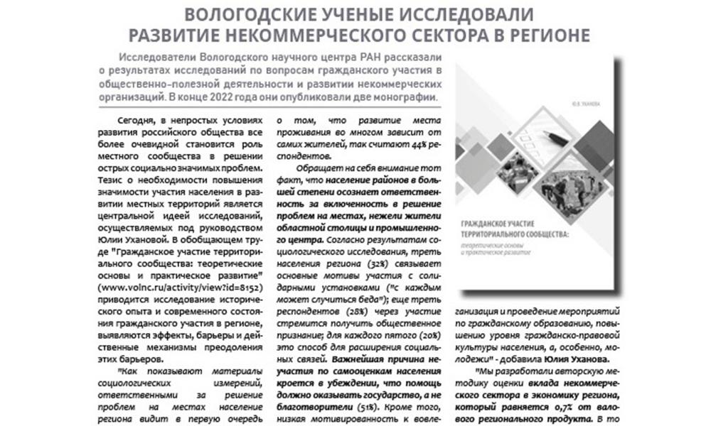 В региональном издании «Гражданское содружество» опубликован материал, посвященный результатам исследований по проблемам гражданского участия и развития некоммерческого сектора в регионе. Представлена информация о научном труде зав. лаб., старшего научного сотрудника, кандидата исторических наук Юлии Викторовны Ухановой – «Гражданское участие территориального сообщества: теоретические основы и практическое развитие» и монографии старшего научного сотрудника, кандидата экономических наук Ксении Евгеньевны Косыгиной – «Некоммерческий сектор в экономике региона» (под научным руководством директора ВолНЦ РАН, д.э.н. А.А. Шабуновой).
